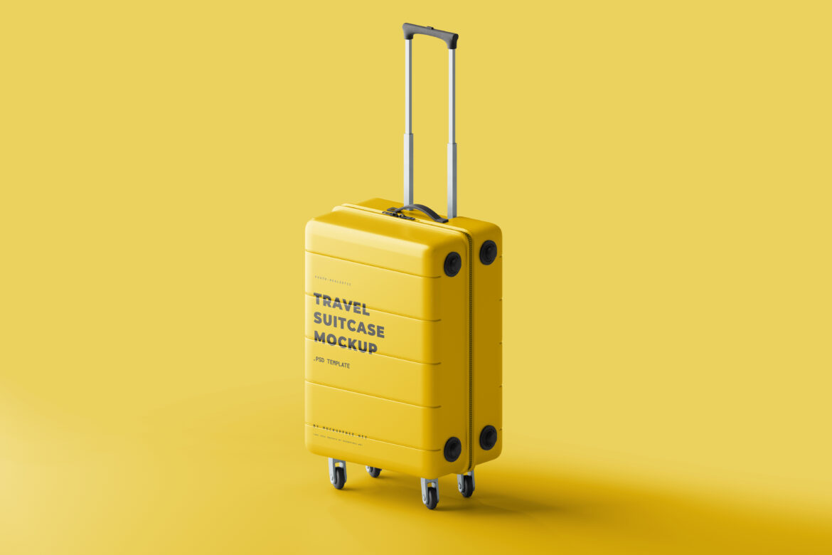 A travel suitcase mockup set including 8x mockup scenes. this can be used for anything travel, tourism related adverts. just put your design in the bag and generate realistic images.