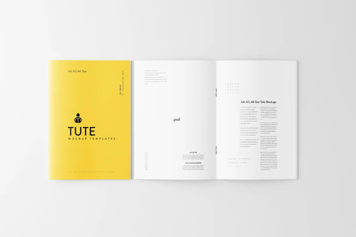 A tute or tutorial brochure mockup collection. We have created a set of mockups for tutorial brochures in different sizes: A4, A5, and A6. A “tute” is like a guide that colleges, universities, and tutoring classes use to teach students.