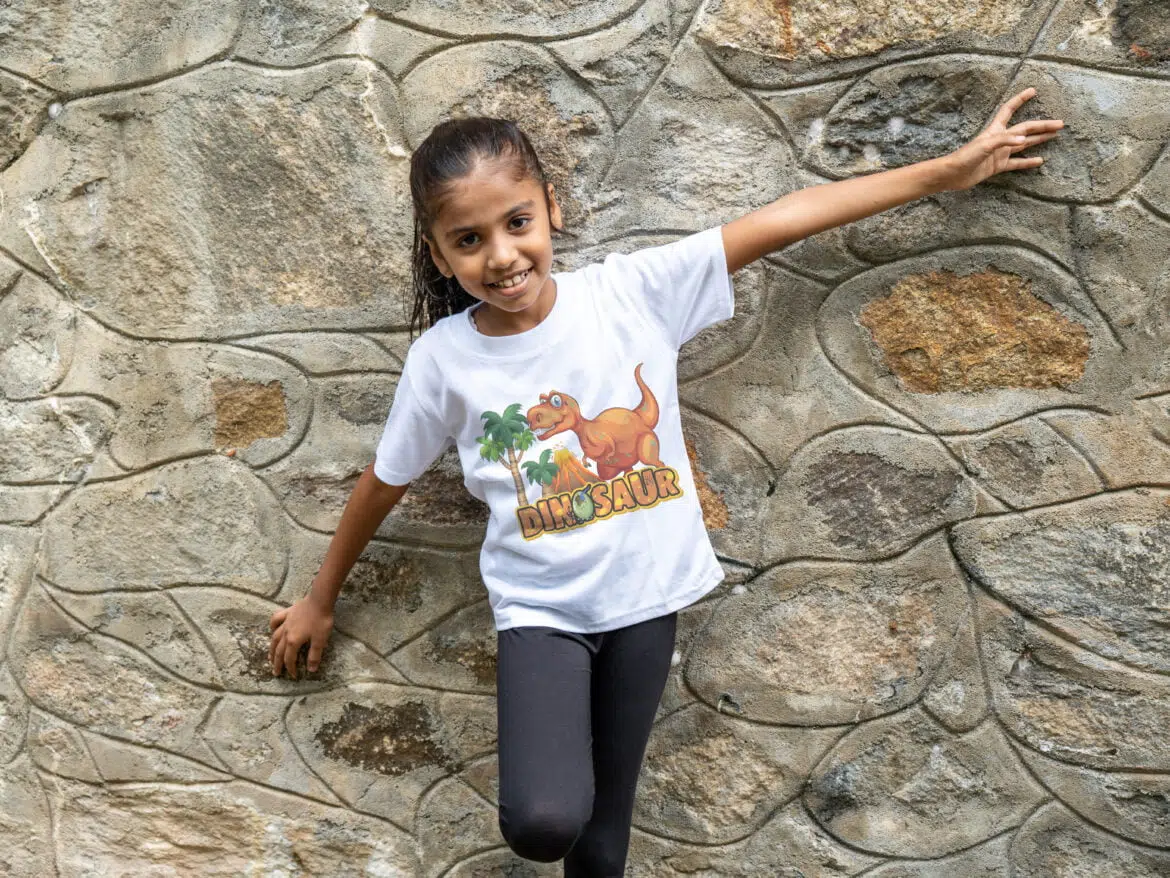 A T-shirt mockup for tween girl t-shirt designs. A young girl wearing a white short sleeve T-shirt and a black leggin.