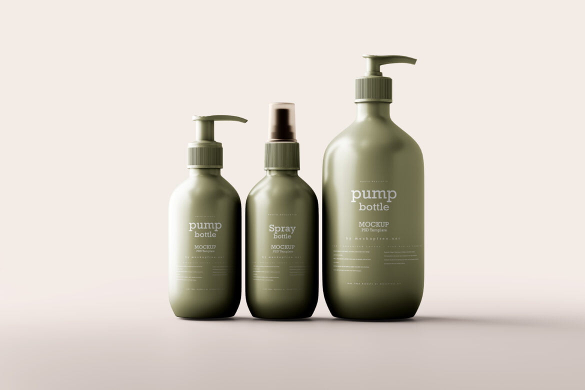 A mockup scene containing two size pump bottles and a spray bottle. A total of three cosmetic bottle mockup scene.
