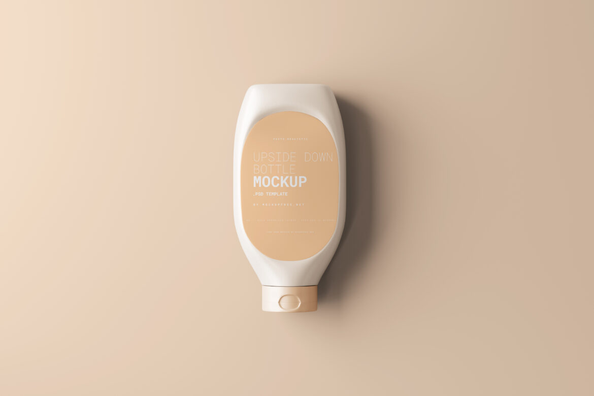This is an upside down bottle mockup set for products like ketchup, mustard and other liquid food products. five bottle mockups in few different angles.