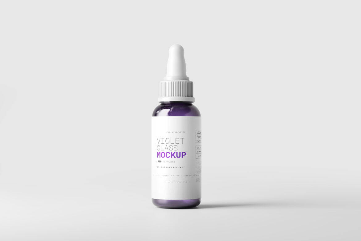 A common type of Orion dropper bottle made with violet glass made in to five different mockups. An Orion dropper bottle usually used for packaging of liquids 10ml to 50ml or between. for serums, oils and medicines. Also known as Boston Round bottle design, with its short, rounded shoulders.