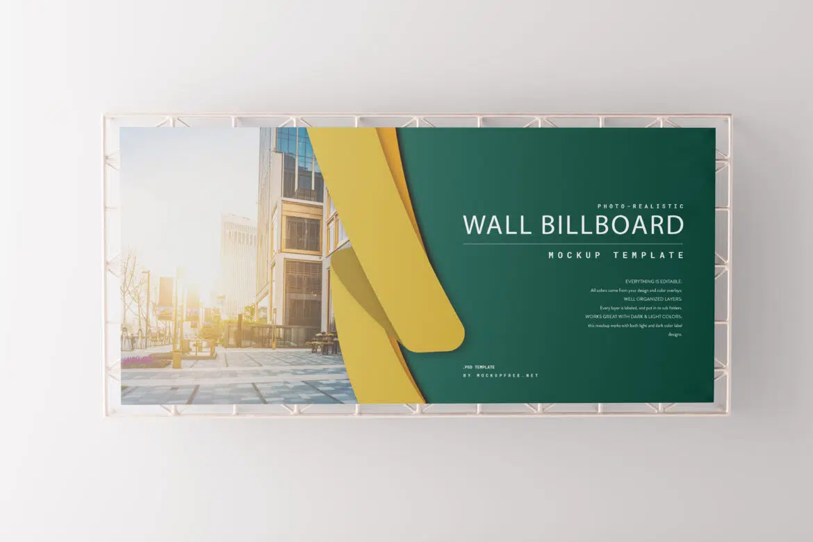 This is a billboard on wall mockup set. has a metal frame for support and the frame color is changeable. middle billboard is standard size (10×40) and attached to the wall by frame. includes five billboard mockups and some of them features a brick wall and the others has a plain color wall so you can apply your own colors.